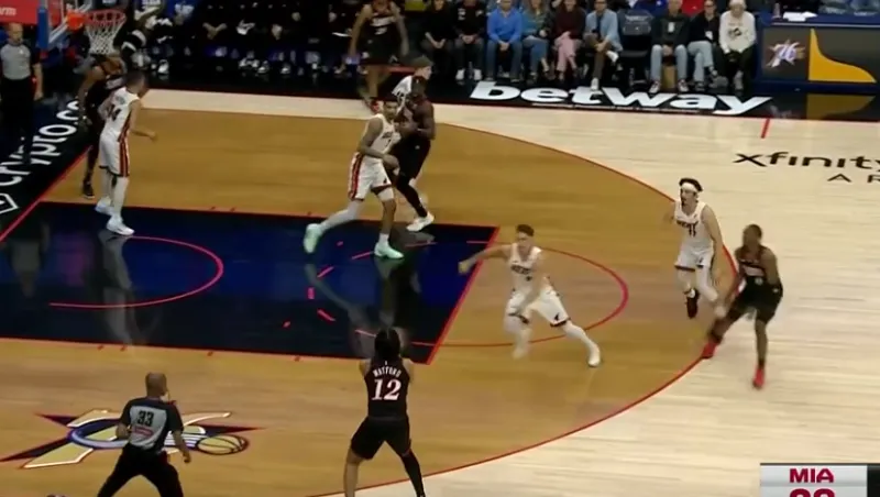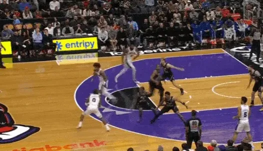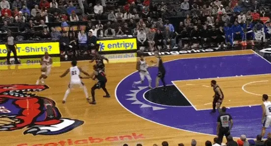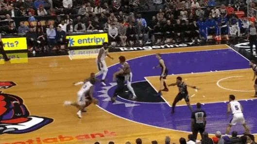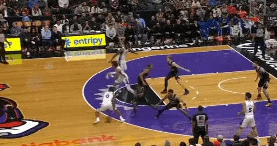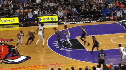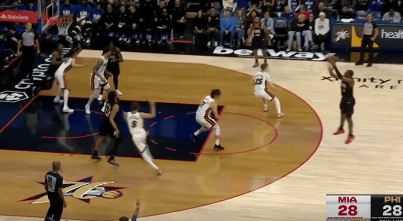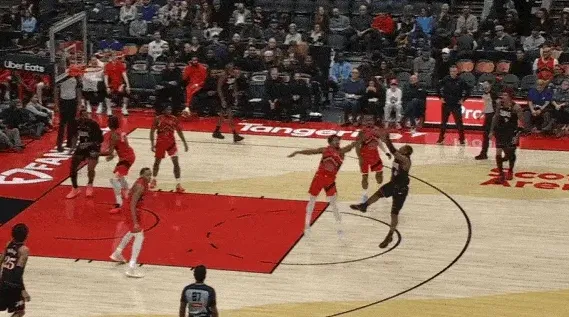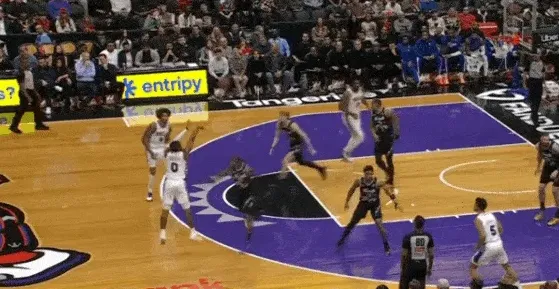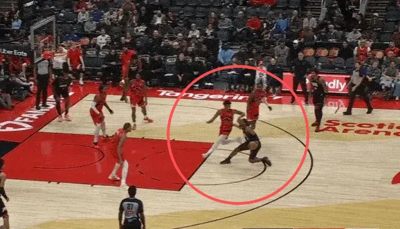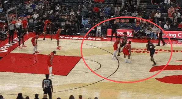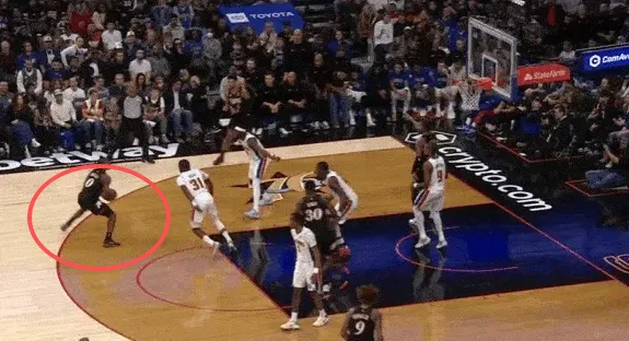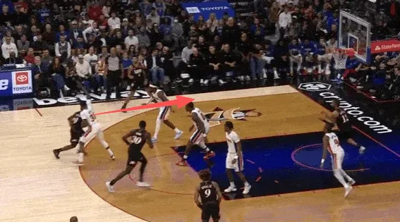 马克西和乌布雷发动挡拆配合后立即启动左路突破,利用广阔的中路空间闪转腾挪,行进间刺探急停晃飞追防的阿巴基后立即前脚蹬地衔接撤步中投。
